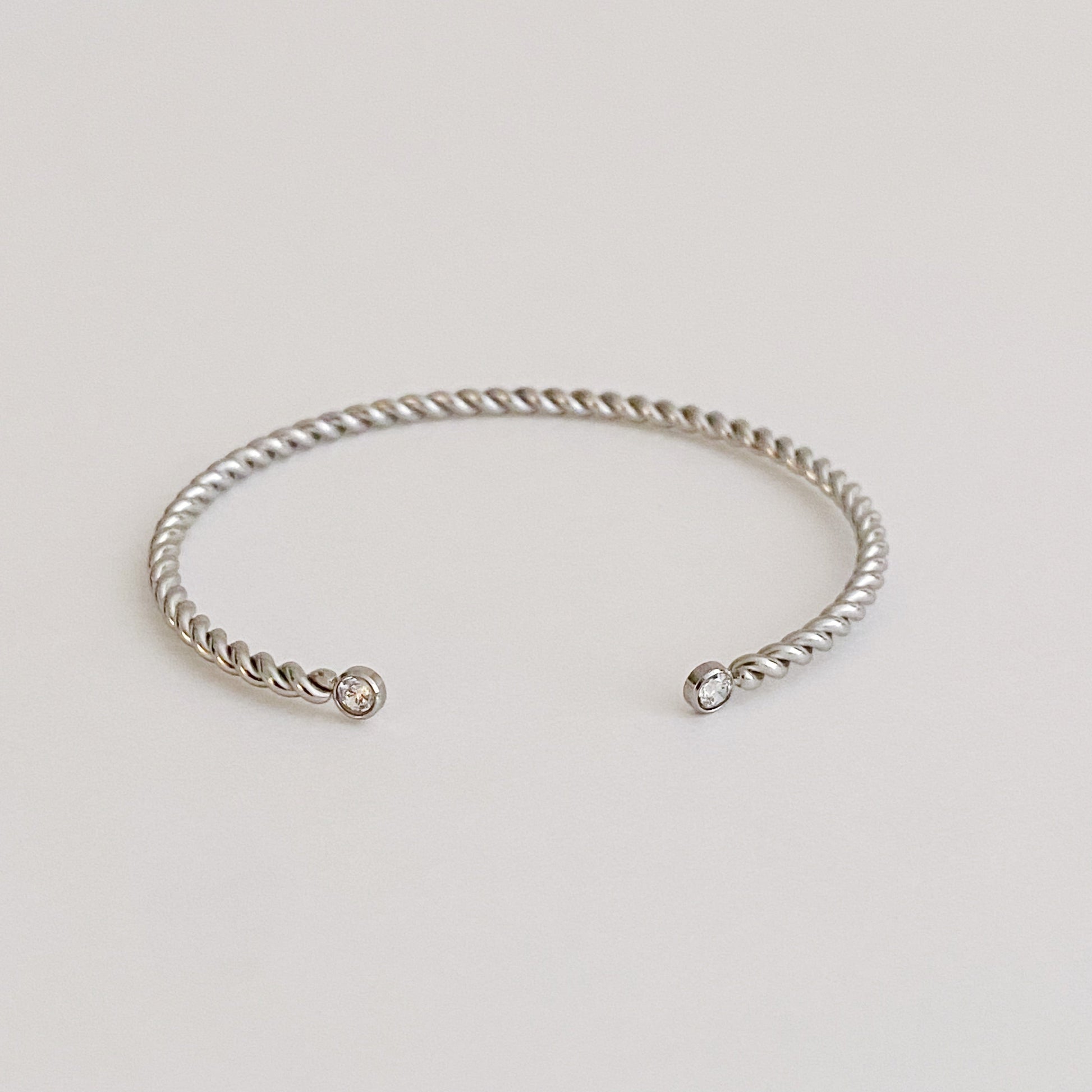Sleek, timeless, and effortlessly chic — this bracelet features a slim, cabled design with delicate sparkling stones accenting each end. Its flexible open style ensures a comfortable fit while adding just the right touch of shine. Perfect for wearing solo for subtle sophistication or layering with other pieces for a statement look.